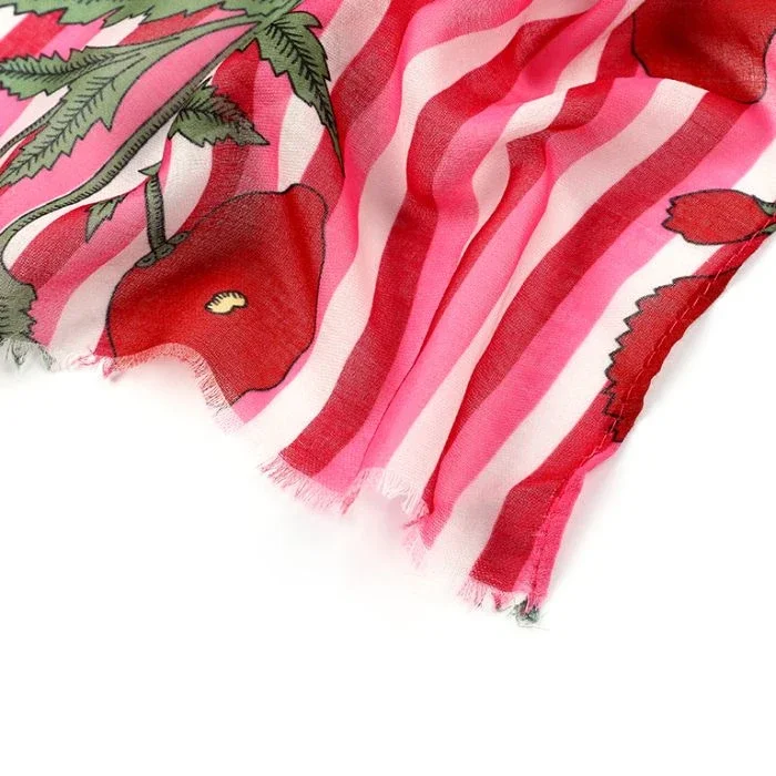 Prachtige vrolijke sjaal met bloemen en streepjes in de kleur roze en rood.