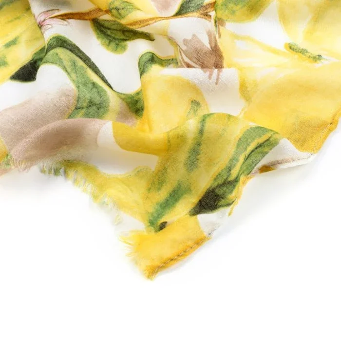 Prachtige vrolijke sjaal in de kleuren geel, taupe en groen met een leuk printje.