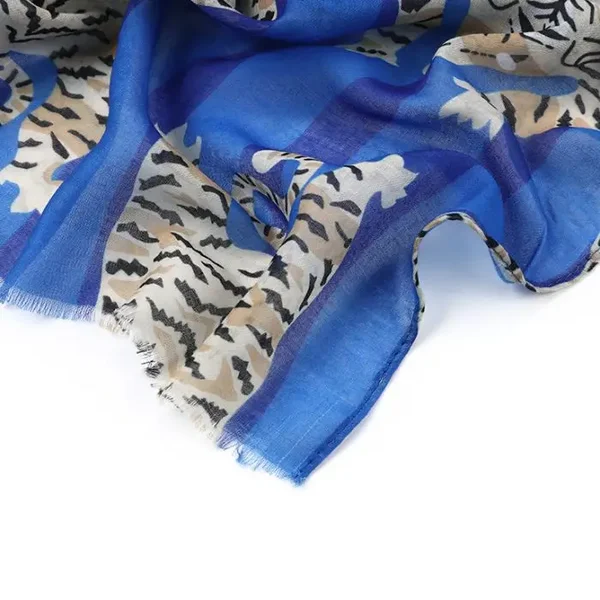Prahtige kobalt kleurige sjaal met print van een tijger.