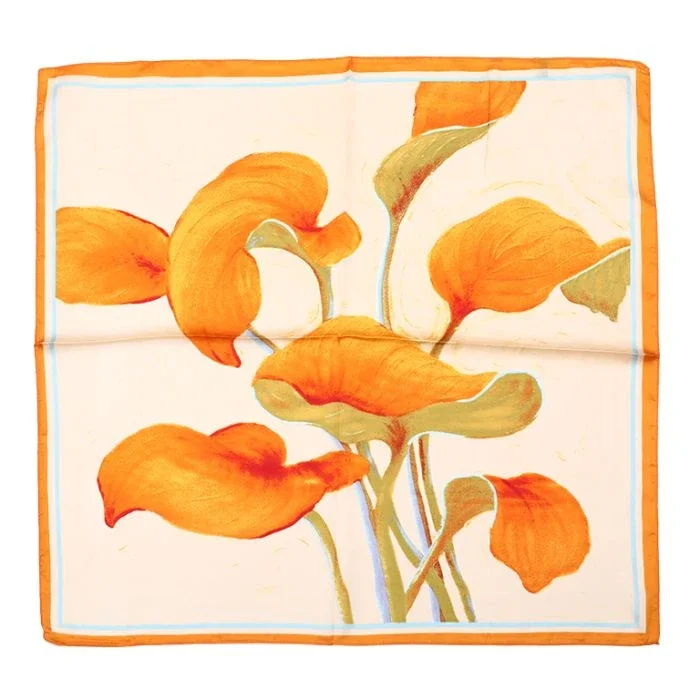 Helemaal hip, dit korte sjaaltje met oranje bloemen. Draag hem om je nek, je tas, aan je broek of in je haar!