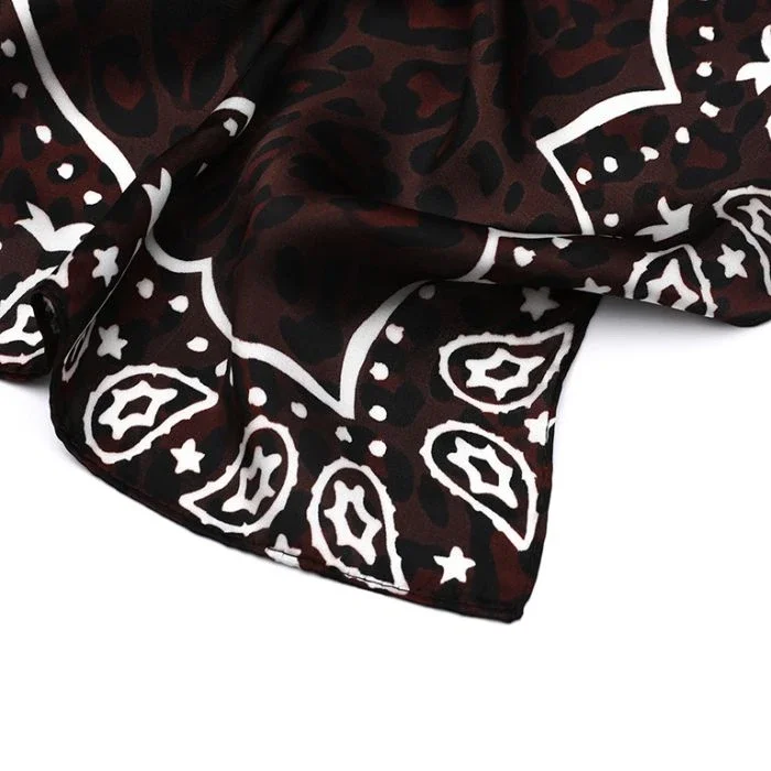 Helemaal hip, dit korte sjaaltje met panterprint en andere details in de kleur coffee. Draag hem om je nek, je tas, aan je broek of in je haar!