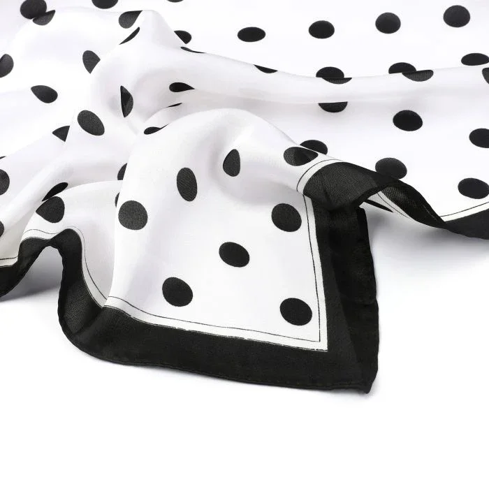 Helemaal hip, dit korte sjaaltje met dots zwart wit. Draag hem om je nek, je tas, aan je broek of in je haar!