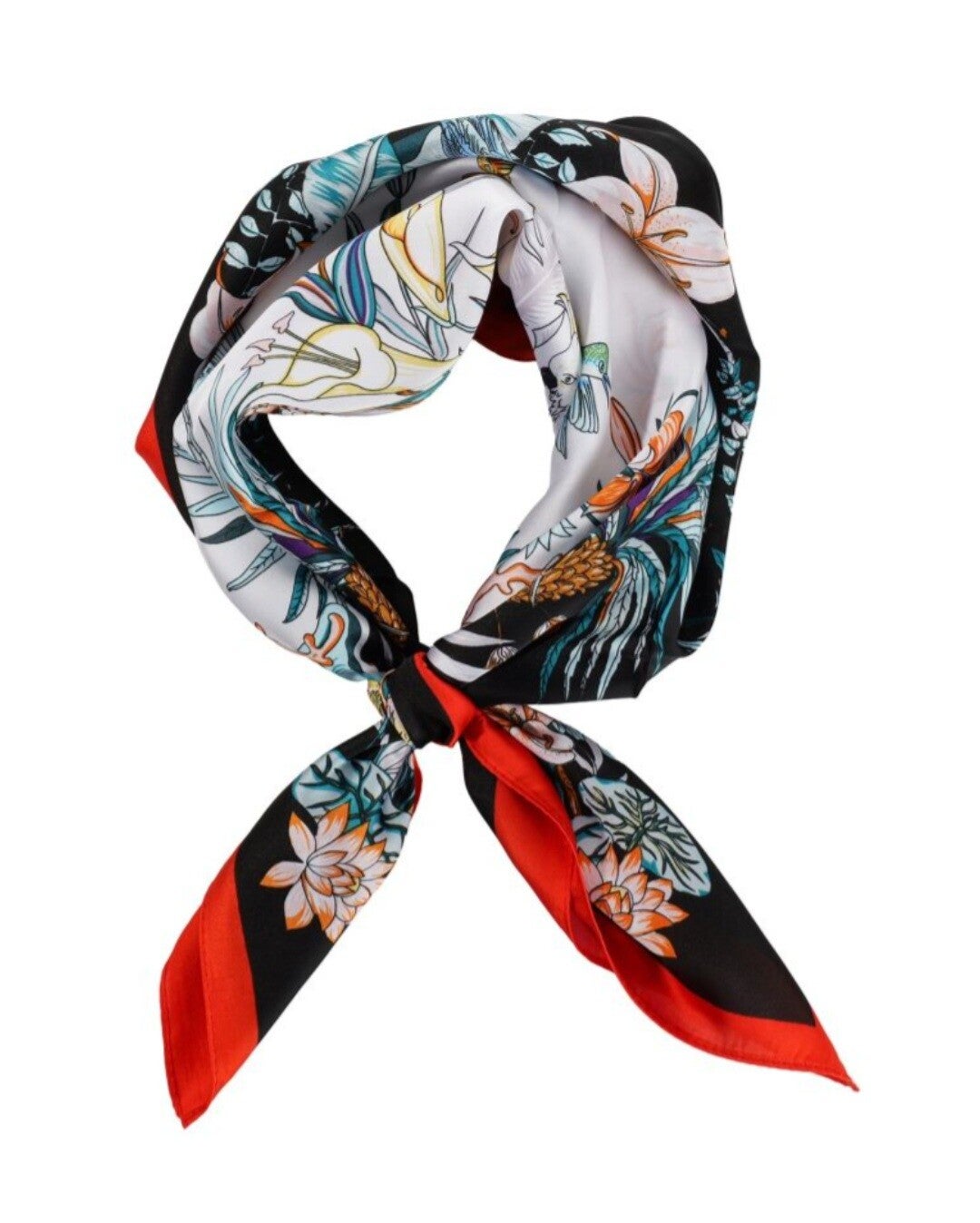 Helemaal hip, dit korte sjaaltje met een tropisch bloemen printje. Draag hem om je nek, je tas of in je haar!
